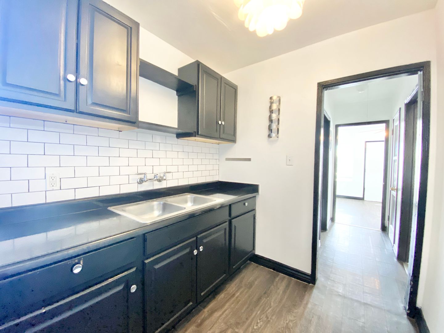 Renovated kitchen with eat-in bar, chalkboard wall, and subway tile backsplash